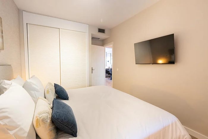 With stylish contemporary interiors, these one bedroom apartments are ideal for couples, smaller groups or families. The bedroom has a queen bed, a wall-mounted 42” Smart TV and plenty of space for unpacking. The open-plan living area has a 55” Smart TV with a double sofa bed for extra guests, and armchair.